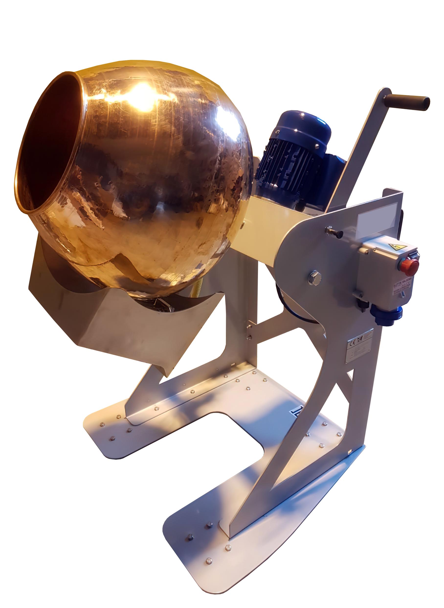 The PRA50 model is the light and cheaper version of the model PRA60 for the caramelization of seeds (almonds, hazelnuts, peanuts, dried fruit, pistachios, etc.). The simple design and devoid of complex electronics allows an easy use in open environments (fairs, events, etc.) or for laboratories supplying large-scale distribution and shops in general. The indicative hourly production is about 16-20kg/h.The rotation speed of the copper tank is 30rpm. The working inclination is +25° and the product unloading is provided with the comfortable handle bar, supported by apposite springs. The PRA50 has 1 powerfull heater that can be used with LPG or METHANE gas, the heat power can be manage manually by the GAS valve. Available only in painted iron, the weight of the PRA50 is approximately 125Kg.